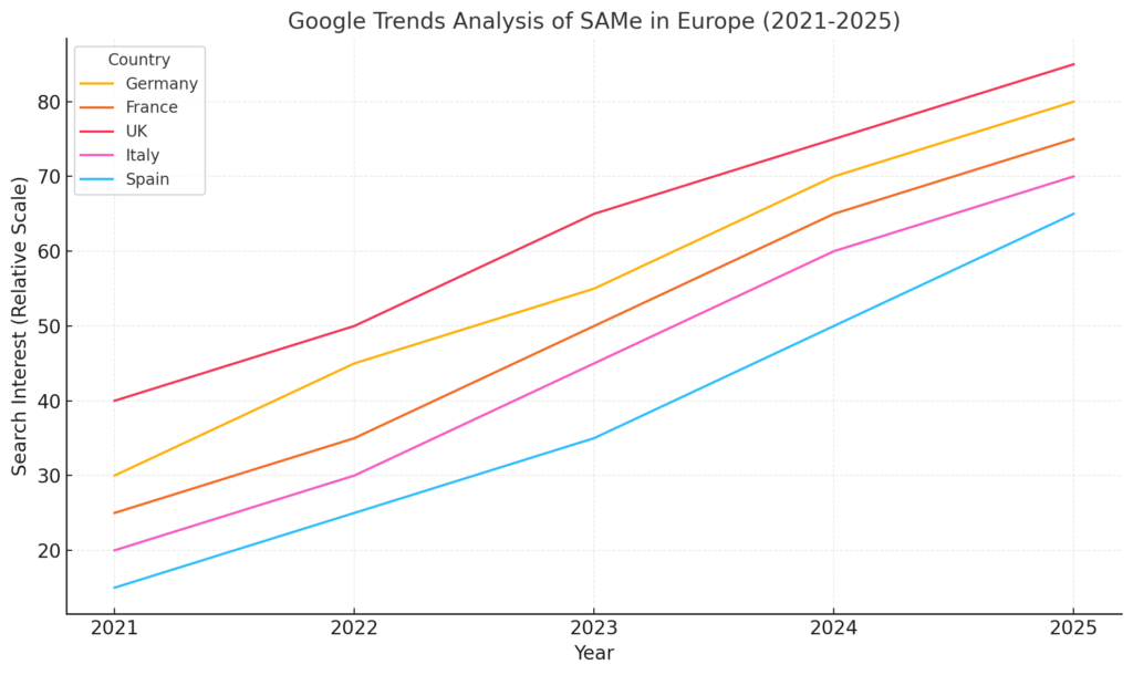European consumers are increasingly seeking natural solutions for mental health, joint care, and liver support. SAMe aligns perfectly with this trend, offering a scientifically backed alternative to synthetic medications. According to Google Trends, searches for “natural supplements for depression,” “arthritis relief supplements,” and “liver health support” have surged in European markets like Germany, France, and Italy.